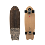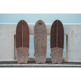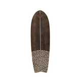 Materiales empleados: 6 láminas de madera de abedul nórdico, revestido en la parte frontal con madera de eucalipto fumé mallado y una tira fina de arce canadiense, la parte posterior está revestida con madera de haya vaporizada. La elegancia a ésta tabla se lo aporta la combinación de la tela de algodón con motivo animal Print en tonos negro y gris empleada en la parte inferior junto con el color casi negro del eucalipto ahumado